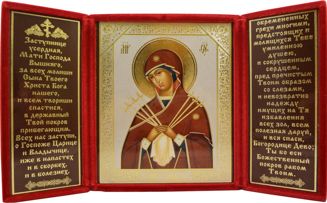 Складень Семистрельная Божия Матерь с молитвой, бархат 13х16 см