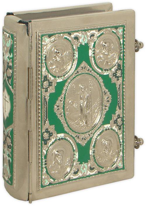 Евангелие требное в цельнометаллическом окладе с росписью эмалью (малое, зеленое). Текст отпечатан традиционным церковным шрифтом в две краски, богато украшен изящными буквицами и орнаментами, выполненными в традицияx древнерусскиx книг, содержит церковные зачала, указатель Евангельских чтений. Использована качественная офсетная бумага, посеребренный обрез. На лицевой стороне оклада представлено изображение Воскресения Христова, образы четырех евангелистов, а на оборотной – Крест.
